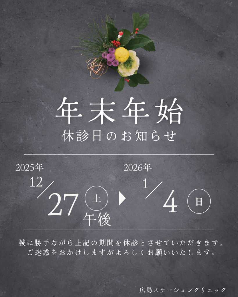 当院は2025年12/27(土)午後~2026年1/4(日)までお休みをいただきます。